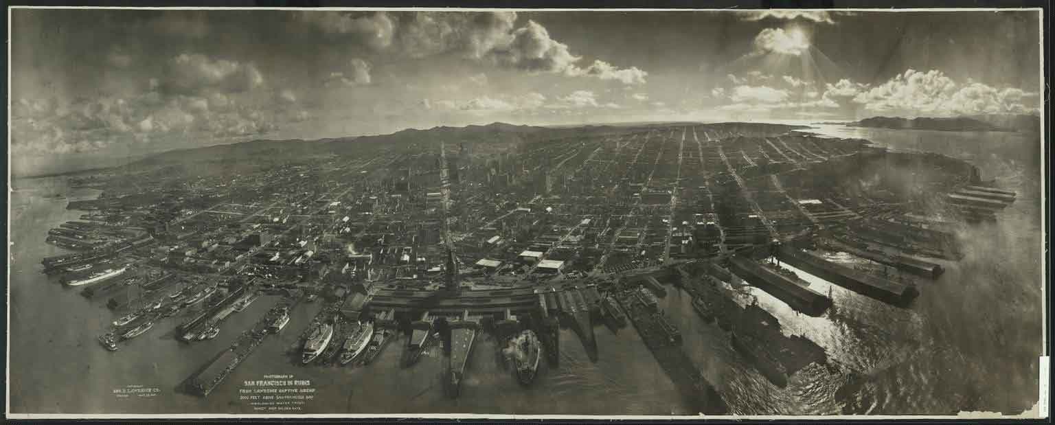عکسی از سانفرانسیسکو در ویرانههایی از کشتی هوایی اسیر لارنس، ۲۰۰۰ فوت بالاتر از خلیج سانفرانسیسکو مشرف به جلوی آب. غروب خورشید بر فراز گلدن گیت در حدود سال 1906
