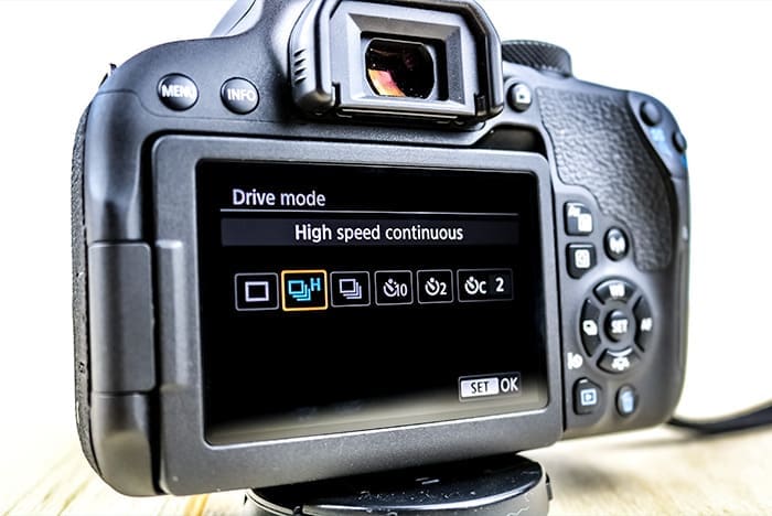 در برخی از دوربین ها، حالت عکسبرداری پیوسته به اختصار CL و CH برای کم و مداوم زیاد است؛ یا از میانبر دکمه ای استفاده می کنید که با نام”درایو” مشخص شده است.